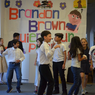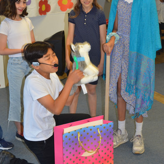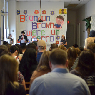 The Upper Elementary students presented "Brandon Brown Quiere Un Perro," dramatizing a book they read in their Spanish class throughout the year. Spanish teacher Ms. Lucrecia Paredes directed the fourth and fifth graders. Every student had a speaking role, including some choral numbers. The performance was lauded by a standing-room-only audience of about 70 parents and teachers.